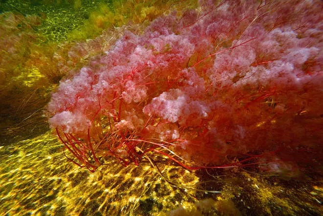 Có thể dễ dàng nhìn thấy lớp tảo mềm mại màu hồng đào tuyệt đẹp dưới lòng sông nổi bật qua làn nước trong suốt.