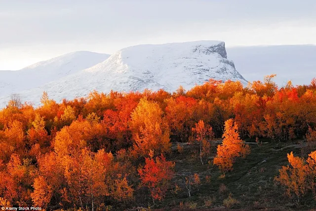 Cây cối chuyển màu đỏ rực tại công viên quốc gia Abisko, Thụy Điển trên nền núi tuyết trắng xóa.